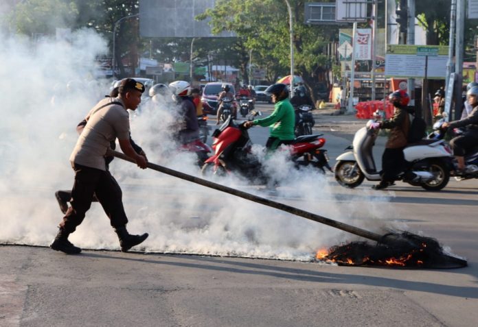 PEDOMANRAKYAT.SUNGGUMINASA–Untuk melancarkan arus lalu lintas, setelah pendemo bubar, petugas Polres Gowa langsung bersihkan sisa-sisa pembakaran ban bekas di depan Kantor DPRD Gowa dan di batas Kota Gowa- Makassar, Senin (11/04/22).