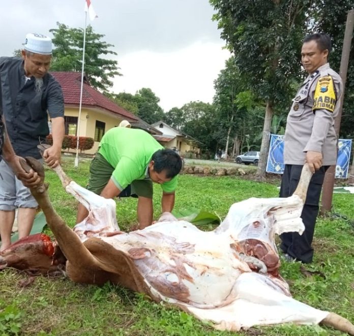 PEDOMANRAKYAT.SUNGGUMINASA–Bertempat di halaman Polsek Tompobulu Polres Gowa, Kapolsek Iptu Abdul Hakim laksanakan pemotongan hewan Qurban, Senin 11 Juli 2022.