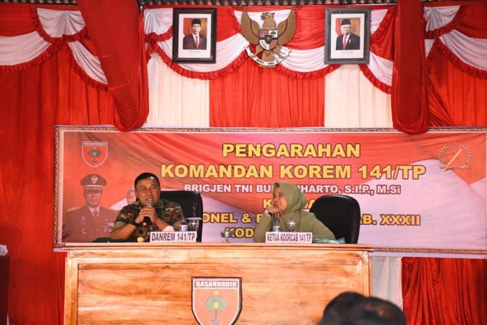 PEDOMANRAKYAT, SINJAI – Komandan Korem (Danrem) 141/Toddopuli, Brigjen TNI Budi Suharto bersama Ketua KCK Koorcab Rem 141/Tp, Lina Budi Suharto melakukan kunjungan kerja di Markas Kodim 1424 Sinjai, Kamis (15/12/2022).