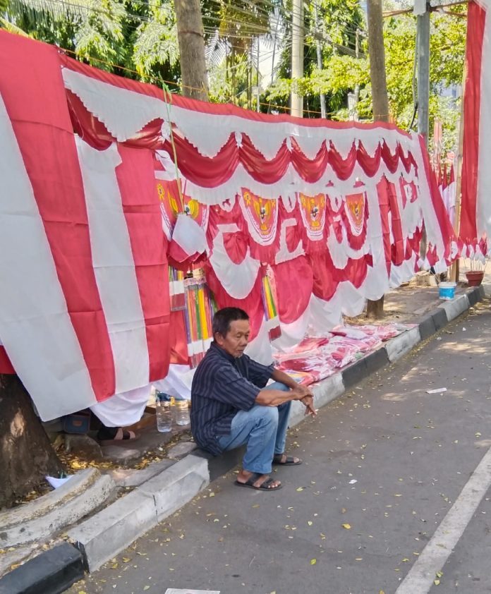Salah seorang pedagang yang biasa disapa Anto ( 60 tahun ) penduduk Jalan Veteran Utara yang setiap tahunnya memamfaatkan bulan Agustus untuk meraup pundi-pundi rupiah keuntungan dari penjualan bendera merah putih mengatakan, berjualan atribut kemerdekaan ini sudah dilakoni hampir seperempat abad, dan masa yang paling ” menyedihkan ” ketika pandemi Covid-19, untung kalau ada yang beli selembar bendera dalam seharinya.