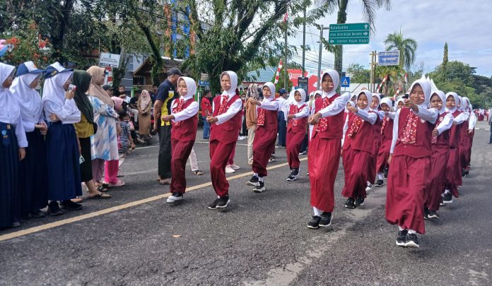 PEDOMANRAKYAT, SINJAI — Bupati Sinjai Dra.Hj. Ratnawati Arif menyaksikan peserta lomba gerak jalan indah, di depan Rumah Jabatan Bupati Sinjai Jalan Persatuan Raya, Senin (11/8/2025).