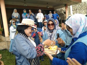 Menambah keceriaan suasana, kegiatan ini juga dirangkaikan dengan perayaan ulang tahun Hj. Helmy Wahid, salah satu peserta arisan. Dalam momen hangat tersebut, Hj. Helmy yang didampingi suami, ibu, dan anak-anaknya tampak terharu ketika meniup tujuh kue ulang tahun sambil diiringi lagu Selamat Ulang Tahun oleh seluruh peserta.