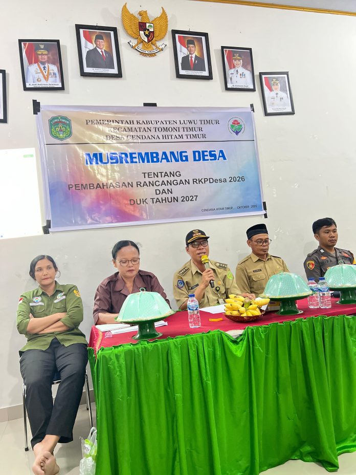 PEDOMANRAKYAT, LUTIM – Pemerintah Desa Cendana Hitam Timur Kecamatan Tomoni Timur Kabupaten Luwu Timur menggelar musyawarah perencanaan pembangunan desa dalam rangka penyusunan Rencana Kerja Pemerintah Desa (RKPDes) Tahun 2026, Senin (6/10/2025), di Aula Kantor Desa Cendana Hitam Timur.