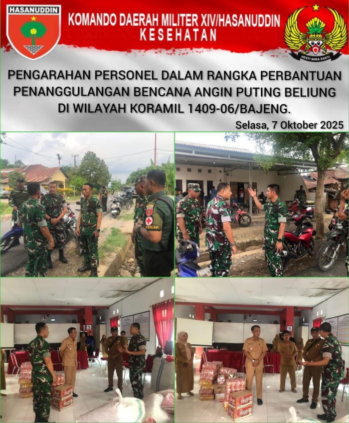 PEDOMANRAKYAT, GOWA – Kodam XIV/Hasanuddin bergerak cepat merespons bencana angin puting beliung yang melanda Kabupaten Gowa, Sulawesi Selatan, Senin malam (6/10) sekitar pukul 23.00 Wita. Sebanyak 450 prajurit diterjunkan ke berbagai titik terdampak untuk membantu penanganan pascabencana dan meringankan beban masyarakat, Selasa (7/10/2025).
