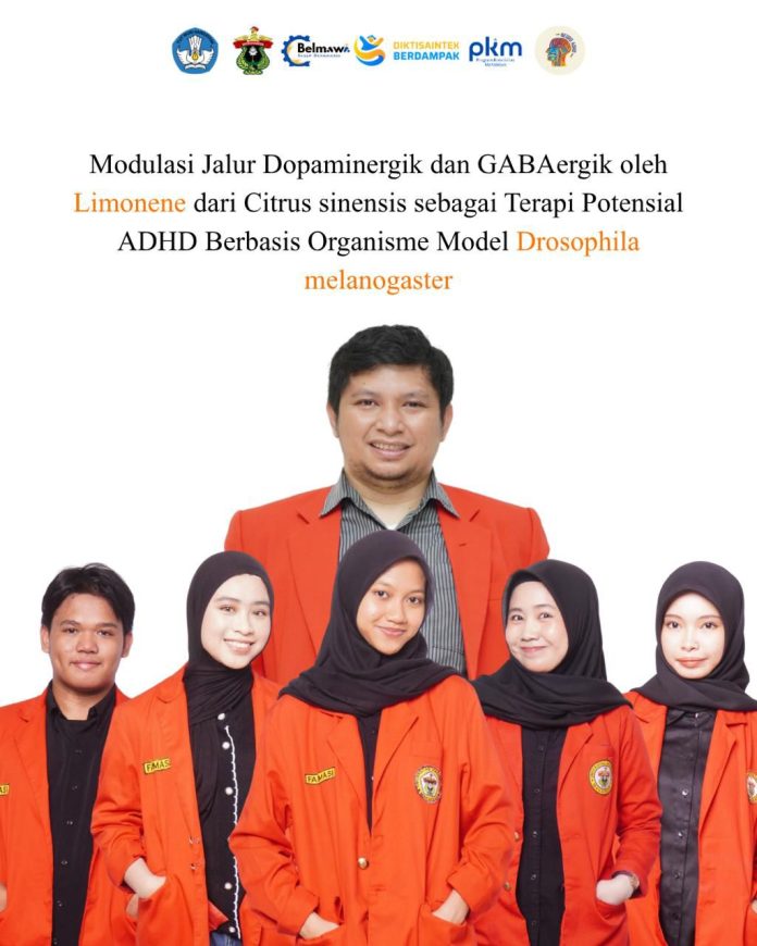 PEDOMANRAKYAT, MAKASSAR – Siapa sangka, dari kulit jeruk manis yang kerap terbuang, lahirlah harapan baru bagi jutaan anak dengan gangguan ADHD dan insomnia. Tim Program Kreativitas Mahasiswa dari Fakultas Farmasi Universitas Hasanuddin di bawah bimbingan Bapak Prof. Firzan Nainu, S.Si. M.Biomed, Ph.D, Apt, dan diketuai oleh Nur Qadriani Ramadani Iqbal, beranggotakan Andi Azhiimah Muizzah Hamka, Alifa Iqramia, Muhammad Taqiyuddin Al Farras, dan Dwi Resky Wulan Surayya, tengah mengembangkan riset inovatif untuk menemukan alternatif terapi alami menggunakan senyawa limonene—komponen utama minyak atsiri kulit jeruk manis—dengan memanfaatkan lalat buah (Drosophila melanogaster) sebagai organisme model.