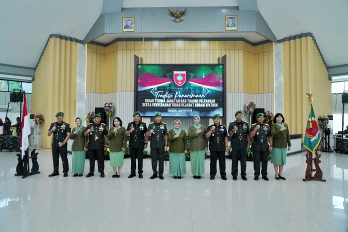 PEDOMANRAKYAT, MAKASSAR – Pangdam XIV/Hasanuddin Mayjen TNI Windiyatno memimpin acara tradisi penerimaan, serah terima jabatan (Sertijab), serta tradisi pelepasan dan penyerahan tugas sejumlah pejabat utama Kodam XIV/Hasanuddin. Kegiatan berlangsung di Balai Pertemuan Hasanuddin, Makodam XIV/Hasanuddin, Jalan Urip Sumoharjo, Kota Makassar, Jumat (10/10/2025).
