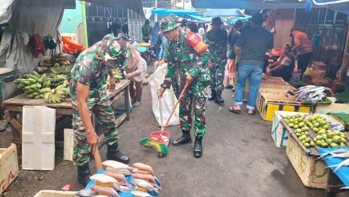 PEDOMANRAKYAT, MAKASSAR – Semangat gotong royong kembali terlihat di wilayah Kecamatan Ujung Tanah, Selasa (14/10/2025) pagi. Personel Koramil 1408-01/Ujung Tanah bersama aparat kelurahan dan warga masyarakat bahu-membahu melaksanakan Karya Bakti pembersihan Pasar Cidu di Kelurahan Tabaringan. Kegiatan yang dimulai pukul 07.35 Wita ini menjadi wujud nyata kepedulian TNI terhadap kebersihan lingkungan serta upaya mencegah bencana banjir dan penyebaran penyakit di tengah masyarakat.