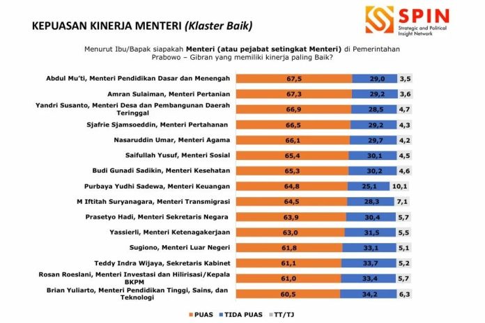 PEDOMANRAKYAT, JAKARTA – Strategic and Political Insight Network (SPIN) merilis hasil survei nasional yang digelar pada 1-9 Oktober 2025. Survei dilakukan sebagai bahan evaluasi terhadap kinerja para menteri kabinet Merah Putih.