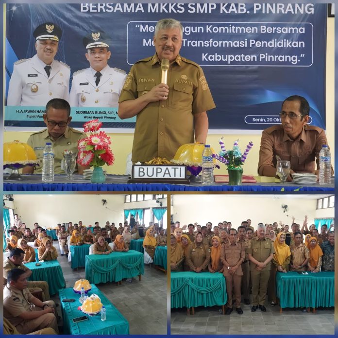 PEDOMANRAKYAT, PINRANG – Kepala Dinas Pendidikan dan Kebudayaan (Disdikbud) Pinrang, A Macca Moenta mendampingi Bupati Irwan Hamid pada kegiatan Silaturahmi Musyawarah Kerja Kepala Sekolah (MKKS) SMP se-Kabupaten Pinrang di Aula SMP Negeri 2 Pinrang, Senin (20/10).