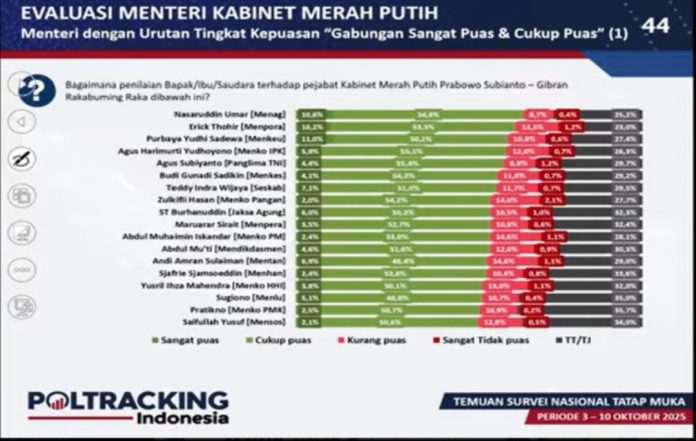 Dari aspek responden yang menyatakan “sangat puas”, posisi teratas justru ditempati Menteri Keuangan Purbaya Yudhi Sadewa dengan 11 persen, diikuti Nasaruddin Umar (10,8 persen), dan Erick Thohir (10,2 persen).