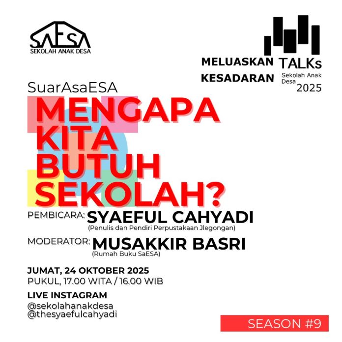 PEDOMANRAKYAT, BULUKUMBA – Sore itu, pukul 17.00 WITA, layar diskusi Sekolah Anak Desa (SaESA) kembali menyala. Dalam seri diskusi bertajuk SuarAsaESA #9, para peserta diajak merenungkan satu pertanyaan mendasar namun sering terabaikan: “Mengapa kita butuh sekolah?”