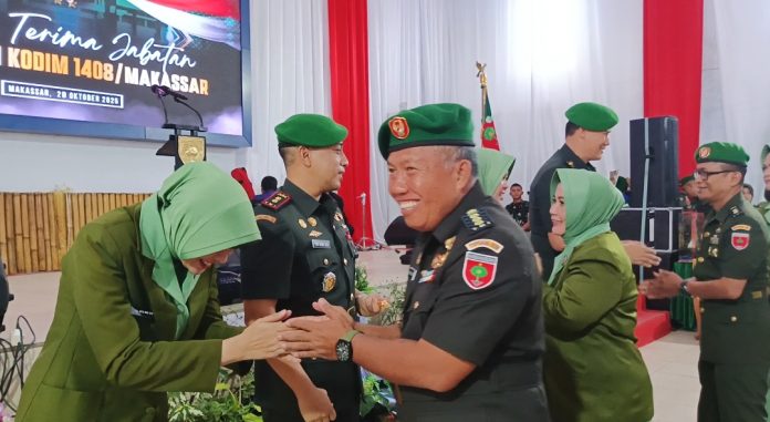 PEDOMANRAKYAT, MAKASSAR – Kepala Topografi Kodam (Katopdam) XIV/Hasanuddin, Kolonel Ctp Abdul Muis Nur, S.Si., bersama Ketua Persit Kartika Chandra Kirana (KCK) Ranting IV Top Cabang II PD XIV/Hasanuddin, Ny. Irma Abdul Muis Nur, menghadiri upacara Serah Terima Jabatan (Sertijab) Komandan Kodim (Dandim) 1408/Makassar yang digelar di Aula Makodim Jalan Lanto Daeng Pasewang, Kota Makassar, Rabu (29/10/2025).