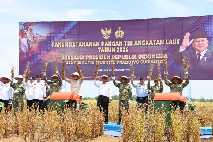 “Masalah pangan adalah masalah strategis. Pangan kita termasuk padi, jagung, kedelai, ayam, telur, minyak goreng, dan seterusnya. Yang belum swasembada adalah kedelai dan ini adalah tugas berat,” kata Mentan Amran usai kegiatan panen raya kedelai Garuda Merah Putih di Permukiman TNI Angkatan Laut (Kimal) di Desa Madukoro, Kecamatan Kotabumi, Kabupaten Lampung Utara pada Rabu (29/10/2025) bersama Menteri Pertahanan, Kepala Staf Kepresidenan, Kepala Staf TNI Angkatan Laut, dan jajaran.