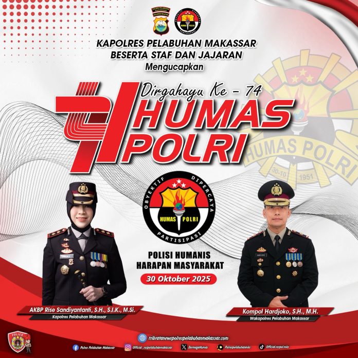 PEDOMANRAKYAT, MAKASSAR – Kapolres Pelabuhan Makassar AKBP Rise Sandiyantanti menyampaikan ucapan selamat Dirgahayu ke-74 Humas Polri, yang diperingati pada hari ini, Kamis, 30 Oktober 2025. Peringatan tahun ini mengusung tema “Polisi Humanis, Harapan Masyarakat,” yang menjadi momentum penting bagi seluruh jajaran Humas Polri untuk terus memperkuat perannya sebagai jembatan komunikasi antara Polri dan masyarakat.