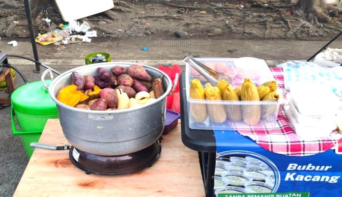 Kepulan asap dari dandang, ‘menari’ mengepul menggoda sepasang mata untuk mendekat. Dijajalinya hasil bumi beraneka warna duduk rapi beraturan. Bentuknya besar-besar dijual Rp10.000 per tiga buah. Ada jagung rebus, labu kuning, ubi jalar, telur rebus, bubur ayam, bubur kacang hijau, buah segar, bubur ketan hitam, hingga bubur Manado.