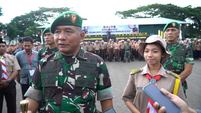 PEDOMANRAKYAT, GOWA – Pangdam XIV/Hasanuddin Mayjen TNI Bangun Nawoko secara resmi menutup kegiatan Perkemahan Sabtu Minggu (Persami) Korps Kadet Republik Indonesia (KKRI) Gelombang III Triwulan IV TA 2025, yang berlangsung di Lapangan Sapta Marga Rindam XIV/Hasanuddin, Pakatto, Kabupaten Gowa, pada Minggu (2/11/2025).