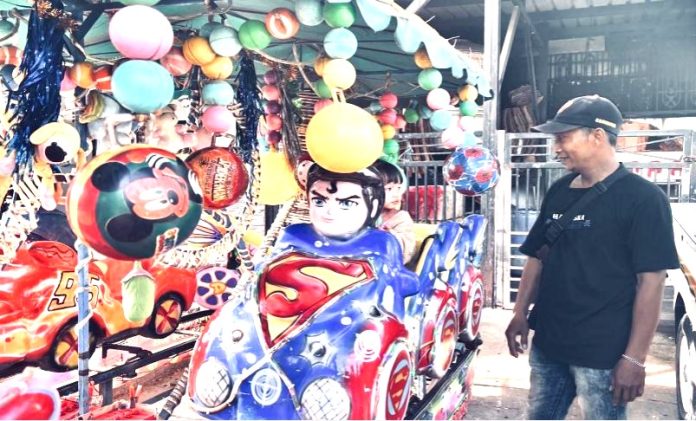 Irwan Dg. Tiro berdiri di samping odong-odong miliknya