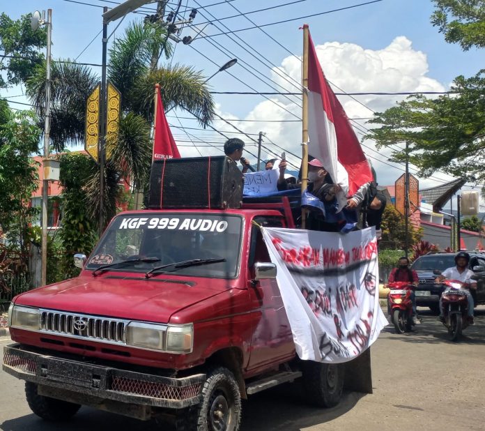 Aksi demonstrasi mahasiswa berangkat dari depan Gedung Pemuda Van de Loosdrecht Rantepao kemudian menuju kantor Gedung DPRD Toraja Utara, Sulawesi Selatan, Rabu (5/11/2025).