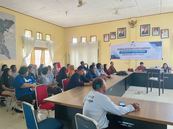 PEDOMANRAKYAT, LUWU TIMUR – Pemerintah Kecamatan Tomoni Timur Kabupaten Luwu Timur menggelar kegiatan Sosialisasi Inovasi Daerah pada Jumat (7/11) di aula kantor kecamatan. Kegiatan ini dibuka langsung oleh Camat Tomoni Timur, Yulius, didampingi Sekretaris Kecamatan, serta Kepala Bidang Riset dan Inovasi Daerah Bapperida Luwu Timur, Ainuddin, S.ST., M.Si, yang hadir sebagai narasumber utama. Kegiatan tersebut diikuti oleh staf kecamatan, perangkat desa, para kepala sekolah, Puskesmas serta pimpinan unit kerja lainnya di wilayah Kecamatan Tomoni Timur.