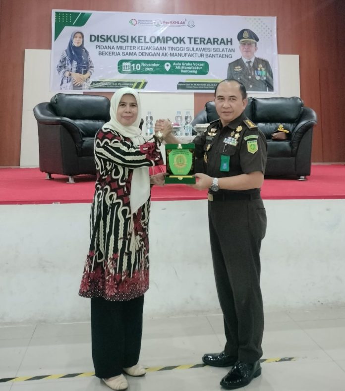 PEDOMANRAKYAT, BANTAENG – Asisten Bidang Pidana Militer Kejaksaan Tinggi Sulsel bekerjasama dengan Akademi Komunitas Manufaktur (AK-Manufaktur) Bantaeng, menggelar acara koordinasi teknis yang diramu dalam bentuk “Diskusi Kelompok Terarah”, mensosialisasikan kedudukan dan tugas Bidang Pidana Militer Kejaksaan RI pada hari Senin (10/11) siang. Diskusi yang dihadiri Direktur, para Pejabat Struktural dan ratusan mahasiswa tersebut mendapat respon yang luar biasa, hal ini terlihat dari banyaknya pertanyaan yang diajukan saat sesi tanya jawab.