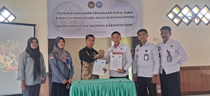 PEDOMANRAKYAT, SOPPENG – Kepala Rutan Kelas IIB Watansoppeng M Arfandy A,Md S.H M.H melakukan penandatangan Memorandum of Understanding (MoU) dengan Kepala Badan Narkotika Nasional (BNN) Kabupaten Bone H Risman Sani di Rutan Watansoppeng ,Selasa 11 November 2025 .
