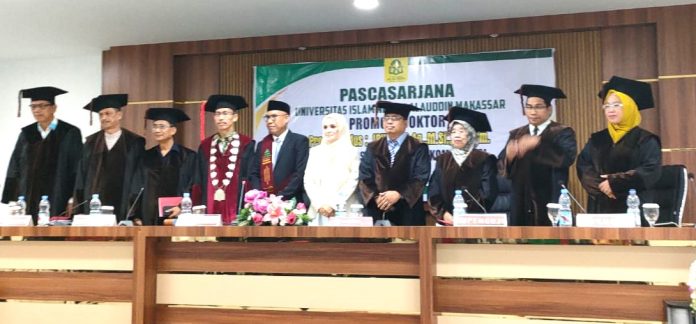 Direktur Program Pascasarjana UINAM Prof. Dr. H. Abustan Ilyas, M.Ag. Mengingatkan kepada promovendus agar tidak berhenti belajar. Bahkan harus mulai belajar kembali.