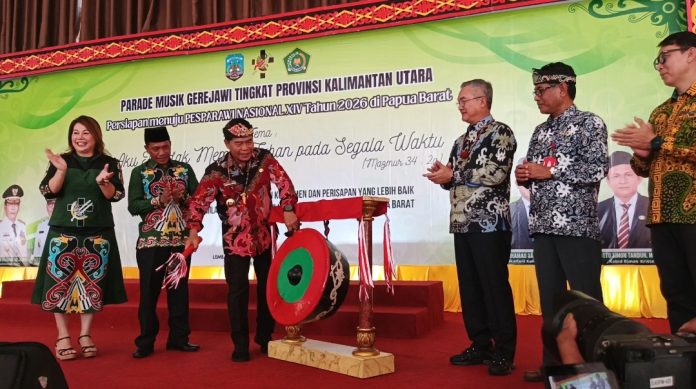 PEDOMANRAKYAT, TARAKAN – Ditandai penabuhan gong sebanyak 6 kali di atas panggung oleh Gubernur Provinsi Kalimantan Utara (Kaltara), Dr. H. Zainal Arifin Paliwang, SH, M.Hum, hajatan seni rohani bertajuk “Parade Musik Gerejawi Tingkat Provinsi Kaltara” resmi dibuka pada Selasa (25/11/2025) sore, bertempat di Gedung Kristen Center, Jl. Akibala, Kota Tarakan.