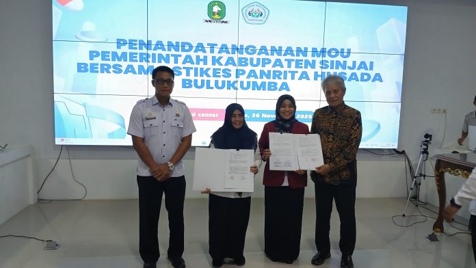 PEDOMANRAKYAT, SINJAI — Pemerintah Kabupaten Sinjai resmi menjalin kerja sama dengan Sekolah Tinggi Ilmu Kesehatan (STIKES) Panrita Husada Bulukumba. Penandatanganan Memorandum of Understanding (MoU) tersebut berlangsung di Gedung Command Center Rumah Jabatan Bupati Sinjai, Rabu (26/11/2025).