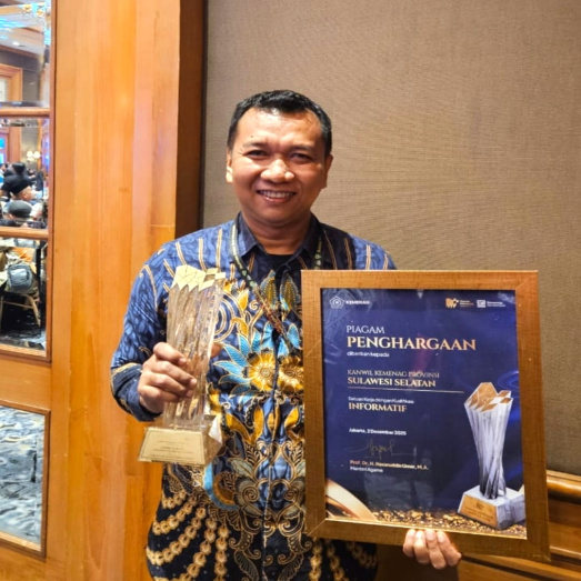 PEDOMANRAKYAT, JAKARTA — Tim Humas, Data, dan Informasi (HDI) Kanwil Kementerian Agama Provinsi Sulawesi Selatan kembali menorehkan kebanggaan. Pada ajang Humas Kemenag Award 2025 yang digelar di Hotel Aryaduta, Jakarta Pusat, Senin (01/12/2025), Kanwil Kemenag Sulsel sukses membawa pulang dua penghargaan sekaligus.