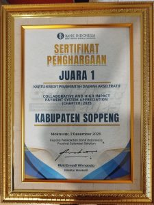 PEDOMANRAKYAT ,SOPPENG – Kabupaten Soppeng berhasil mengukir prestasi atas keberhasilan meraih predikat sebagai juara I Kartu Kredit Pemerintah Daerah (KKPD) Akseleratif pada ajang Collaborative And High Impact Payment System Appreciation (CHAPTER) Tahun 2025 dari Bank Indonesia (BI) .