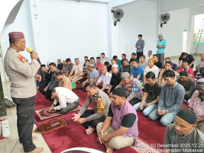 PEDOMANRAKYAT, MAKASSAR – Suasana hangat tampak di Masjid Amanah Ende, Jl. Timor, Kelurahan Ende, Kecamatan Wajo, Kota Makassar, saat program Safari Memakmurkan Masjid kembali digelar oleh Polsek Wajo bersama Seksi Humas Polres Pelabuhan Makassar, Rabu (10/12/2025) siang.