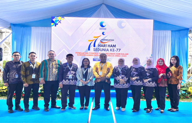 PEDOMANRAKYAT, JAKARTA — Kepala Kantor Wilayah Kementerian Hak Asasi Manusia Sulawesi Selatan, Daniel Rumsowek, menjadi salah satu narasumber yang hadir dalam Puncak Peringatan Hari Hak Asasi Manusia (HAM) Sedunia ke-77 yang digelar di Tennis Indoor Senayan, Rabu (10/12/2025). Ia didampingi Kepala Bagian Tata Usaha dan Umum, Utary Sukmawati, Kepala Bidang Instrumen dan Penguatan HAM, Idawati Parapak, Kepala Bidang Pelayanan dan Kepatuhan HAM, Ayusriadi, serta sejumlah pejabat lainnya.