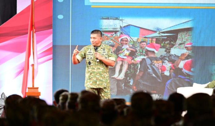 PEDOMANRAKYAT, GOWA – Pangdam XIV/Hasanuddin, Mayjen TNI Bangun Nawoko, memberikan pembekalan kepemimpinan kepada para Kepala Desa peserta Jambore Kepala Desa se-Sulawesi Selatan yang berlangsung di Rindam XIV/Hasanuddin, Jalan Malino, Pakatto, Kabupaten Gowa, Jumat (12/12/2025). Kegiatan ini menjadi momentum strategis untuk memperkuat peran Kepala Desa sebagai ujung tombak pembangunan dan penggerak kemajuan masyarakat di tingkat akar rumput.