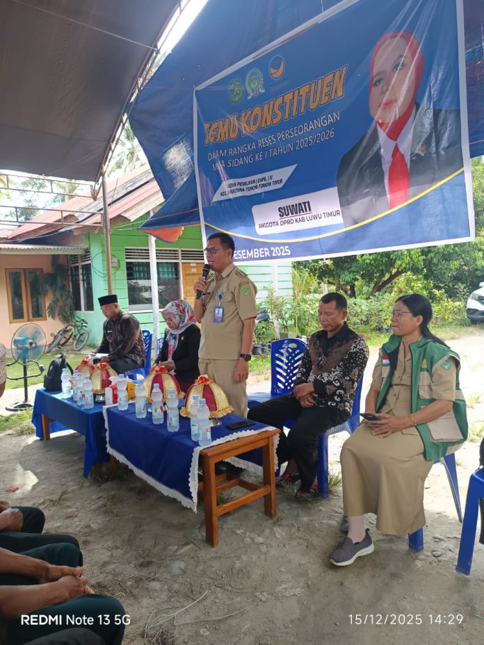 PEDOMANRAKYAT, LUWU TIMUR — Camat Tomoni Timur, Yulius, menghadiri kegiatan reses perseorangan dua anggota DPRD Kabupaten Luwu Timur Daerah Pemilihan IV yang meliputi Kecamatan Tomoni, Tomoni Timur, dan Mangkutana, Senin (15/12/2025).