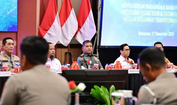 PEDOMANRAKYAT, MAKASSAR – Pangdam XIV/Hasanuddin Mayjen TNI Bangun Nawoko menghadiri Rapat Koordinasi Lintas Sektoral yang dipimpin Gubernur Sulawesi Selatan Andi Sudirman Sulaiman di Hotel Harper Makassar, Rabu (17/12/2025). Rakor tersebut digelar untuk memperkuat sinergi antarinstansi dalam rangka pengamanan perayaan Natal 2025 dan Tahun Baru 2026 di wilayah Sulawesi Selatan.