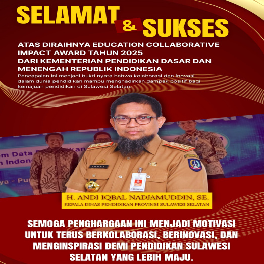 PEDOMANRAKYAT, MAKASSAR — Kepala Dinas Pendidikan Provinsi Sulawesi Selatan, H. Andi Iqbal Nadjamuddin, SE, mengungkapkan keberhasilan Sulawesi Selatan meraih Education Collaborative Impact Award Tahun 2025 dari Kementerian Pendidikan Dasar dan Menengah Republik Indonesia merupakan buah dari kerja kolaboratif lintas sektor yang selama ini dibangun Dinas Pendidikan Sulsel.