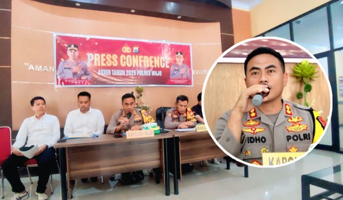 PEDOMANRAKYAT, WAJO – Kepolisian Resor (Polres) Wajo menggelar press conference tahunan untuk memaparkan capaian kinerja selama tahun 2025, di Aula Mapolres Wajo, Rabu (24/12/2025)