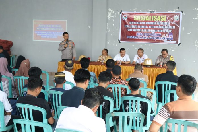 PEDOMANRAKYAT ,SOPPENG – Dalam upaya meningkatkan kesadaran masyarakat serta menangkal bahaya penyebaran berita hoaks dan bahaya narkoba , Kasi Humas dan Kasat Resnarkoba bersama sejumlah personel turun sambangi Desa Umpungeng Kecamatan Lalabata , Rabu 24 Desember 2025