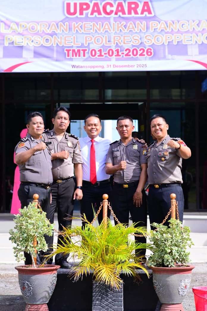 Kasi Humas Polres Soppeng AKP H Husain S,Sos S.H M.H yang dikonfirmasi pedomanrakyat.co.id melalui Aiptu Syamsul Fajar S.E M.M – PS Kasubsi Penmas Humas yang juga mendapat kenaikan pangkat istimewa periode 01 Januari 2026 membenarkan hal tersebut . Tiga personel lainnya masing masing Aiptu Jumaldi S.E – Kanit Resmob Sat Reskrim , Aiptu Arman S.E – Kanit Reskrim Polsek Marioriawa serta Aiptu Jamil S.H – Bhabinkamtibmas Desa Enrekang Polsek Ganra . Keempat personel yang mendapat kenaikan pangkat istimewa menyampaikan rasa syukur dan terimakasih kepada pimpinan.