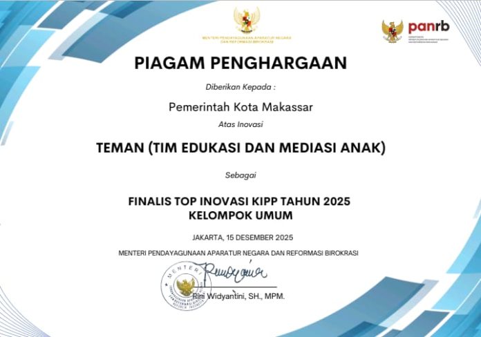 Inovasi TEMAN resmi ditetapkan sebagai Finalis Top Inovasi Kompetisi Inovasi Pelayanan Publik (KIPP) 2025 untuk Kelompok Umum, sebagaimana tercantum dalam Keputusan Menteri PANRB Nomor 330 Tahun 2025 yang menetapkan 273 inovasi terbaik dari seluruh Indonesia.