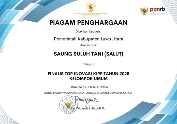 PEDOMANRAKYAT, LUWU UTARA – Pemerintah Kabupaten Luwu Utara (Lutra), Sulawesi Selatan (Sulsel) kembali mengukir prestasi membanggakan di tingkat nasional. Salah satu inovasinya, Saung Tani, menjadi Finalis Top Inovasi Kompetisi Inovasi Pelayanan Publik (KIPP) tingkat Nasional tahun 2025.