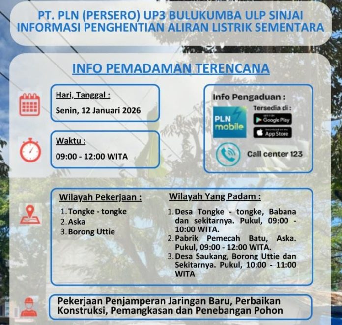 Manager PLN ULP Sinjai, Muh. Ridha Modeong, Minggu 11/1/2026) mengatakan bahwa pemadaman tersebut akan dilaksanakan pada Senin (12/1/2026)Pukul 09.00 – 12.00 WITA.