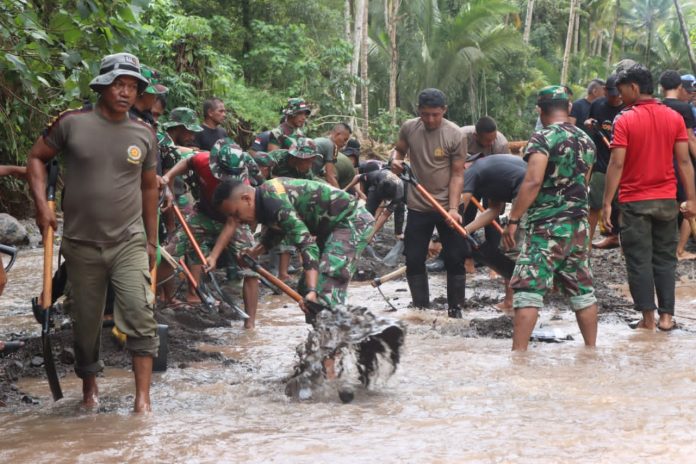 Di wilayah Loloda Utara, beberapa desa yang terkena dampak bencana dan dipenuhi material banjir seperti batu dan kayu yang ukurannya beberapa meter dan besar, langsung ditangani secara manual oleh pihak TNI/Polri.