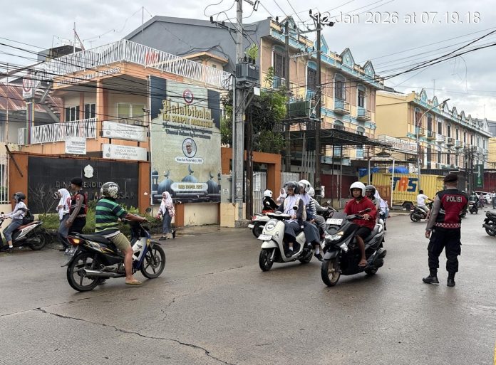 PEDOMANRAKYAT, MAKASSAR – Komitmen Polri dalam menjaga keselamatan generasi muda kembali dibuktikan secara nyata. Di tengah cuaca yang kurang bersahabat berupa hujan deras disertai angin kencang yang melanda Kota Makassar dalam beberapa hari terakhir, Sat Samapta Polres Pelabuhan Makassar tetap konsisten mengintensifkan pengaturan arus lalu lintas dan patroli di depan sekolah-sekolah, khususnya pada jam masuk dan pulang pelajar.
